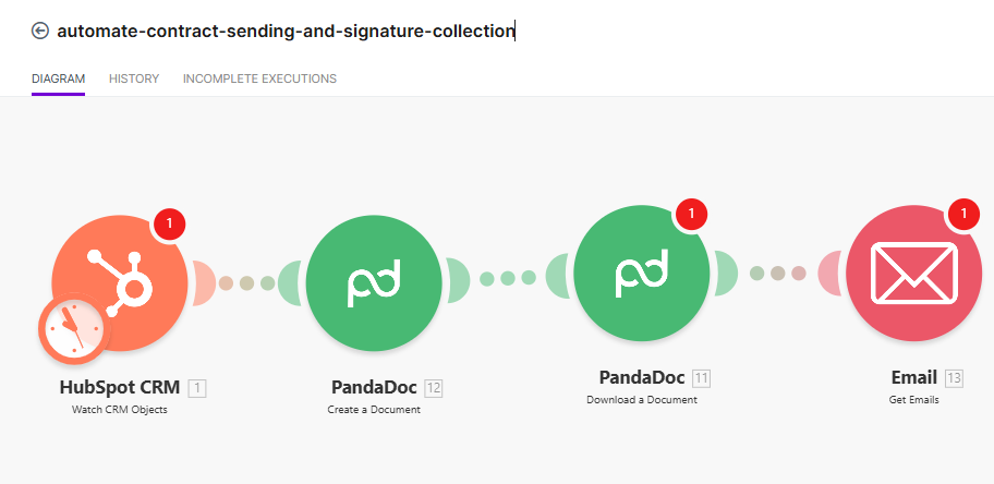 This is where the automation really pays off. When PandaDoc fires a "Document Signed" webhook, Make.com catches it and automatically: